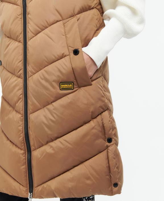 The Barbour International Marathon Gilet boasts a longer length design with shiny panels to the hood and yoke for premium attention to detail. Perfect for an athletic inspired look, this gilet features two lower pockets and is finished with a branded badge to the left side.